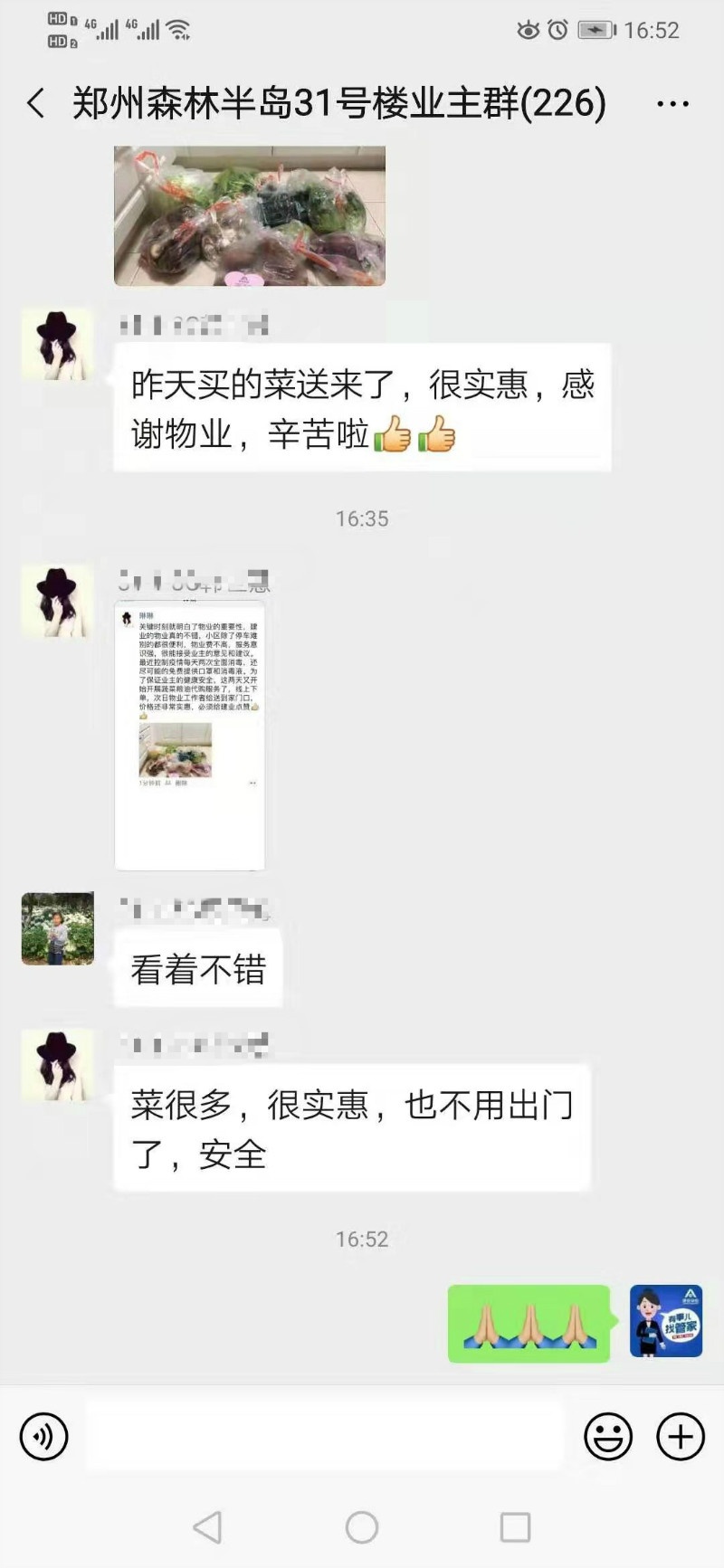 據(jù)不完全統(tǒng)計(jì),截至2月7日上午,建業(yè)物業(yè)累計(jì)為業(yè)主上門配送雞蛋2687件、饅頭2110件,水果套餐3192斤,水餃、湯圓2907件、小麥面粉1216斤,綠色基地小番茄2005斤,蔬菜禮包63448斤,高品質(zhì)產(chǎn)品和貼心服務(wù)使得業(yè)主好評(píng)如潮。