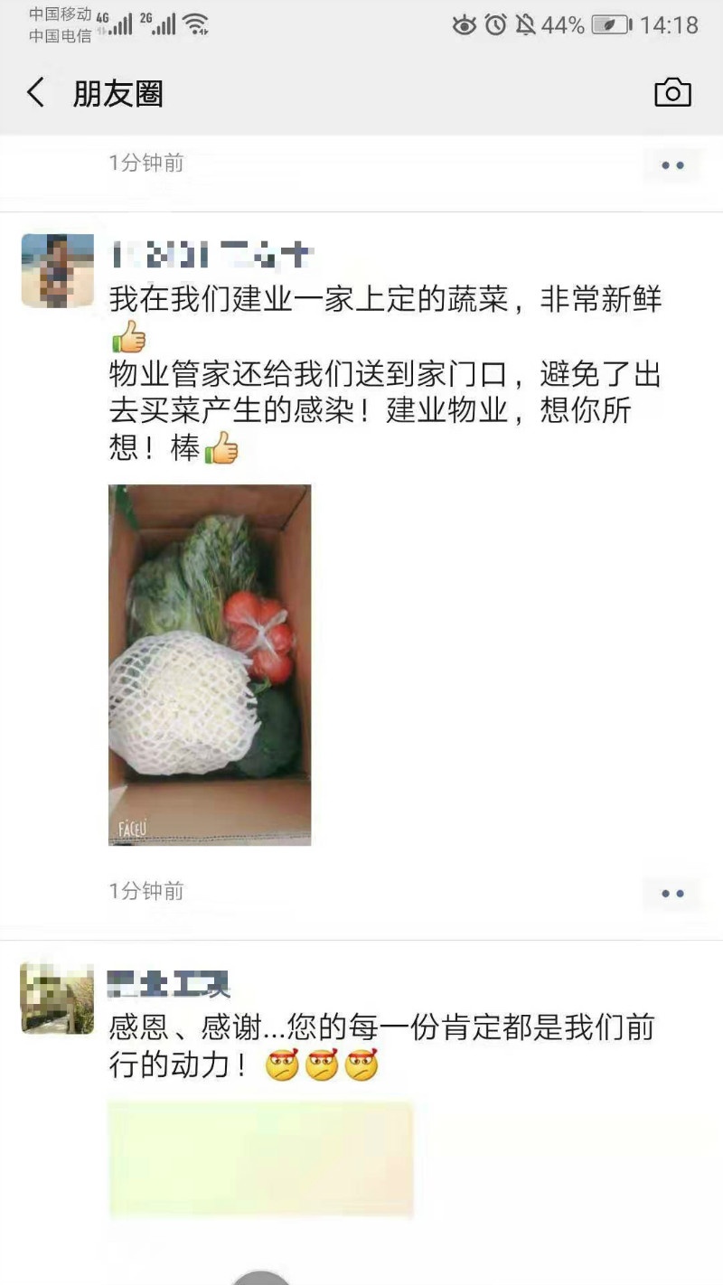 隨著疫情警報(bào)的持續(xù)拉緊,被困在家中的人們?nèi)粘I畋U铣闪穗y題。在防控疫情的特殊時(shí)期,為解決業(yè)主的生活難題,讓業(yè)主足不出戶就能吃上新鮮的蔬菜,購(gòu)買到必需的民生物品,建業(yè)物業(yè)至誠(chéng)園區(qū)公司協(xié)同建業(yè)+、一家公社、建業(yè)新生活農(nóng)業(yè)發(fā)展公司,接力為業(yè)主提供“建業(yè)+最后一公里”服務(wù),將建業(yè)+豐盛幸福生活切實(shí)帶到業(yè)主身邊。