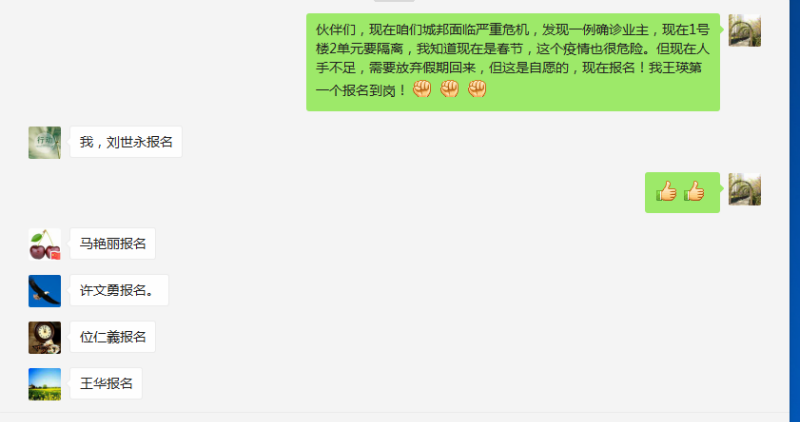 小區(qū)經(jīng)理王瑛則在第一時間趕回崗位全面配合和部署疫情防護工作。當(dāng)她在員工群中發(fā)布疫情防控進展,強調(diào)疫情嚴(yán)重性后,本已調(diào)休在家的貼心管家王棟、魏凱、張城運,安全隊長許文勇、環(huán)境主管王華、維修主管劉世永等人紛紛響應(yīng),主動要求返回崗位。