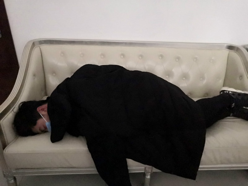 因為疫情,22歲的管家王棟因所租住的小區(qū)安全管控,回不了住處,身高180CM的他蜷著身子在辦公室小沙發(fā)上一睡就是十幾天。他仍樂觀的說:“