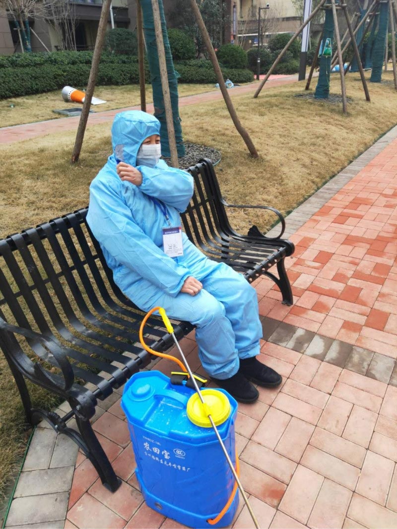 2月8號,已經(jīng)連續(xù)工作11天的李亞偉背著藥桶對園區(qū)進(jìn)行當(dāng)日的第二遍消殺時,腰痛病發(fā)作,一時疼得直不起來。她靠在園區(qū)休閑椅上稍作休息后便又再次投入工作。