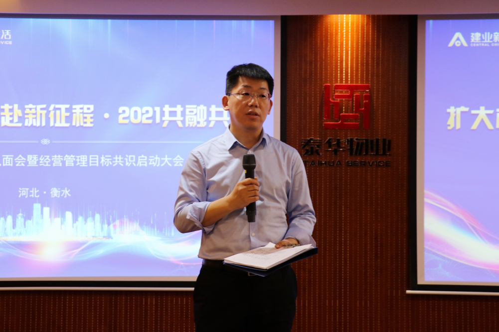 緊接著,泰華錦業(yè)生活常務(wù)副總經(jīng)理李亮亮圍繞泰華錦業(yè)生活2021年度重點工作計劃進行匯報。匯報中,李總明確了泰華錦業(yè)生活未來三年發(fā)展的核心業(yè)績指標,提出“穩(wěn)定主營收入、縱深推進增值服務(wù)”的經(jīng)營策略,“西進北上奔赴京津冀、擴大根據(jù)地”的市場發(fā)展戰(zhàn)略,同時圍繞聚焦融合、凝聚團隊、降本提質(zhì)增效,案場煥新行動、新長征100人才戰(zhàn)略、創(chuàng)新發(fā)展、對標學習、建業(yè)大服務(wù)體系體驗、行業(yè)課題研究以及紅色物業(yè)城市運營商等內(nèi)容進行匯報。
