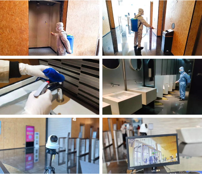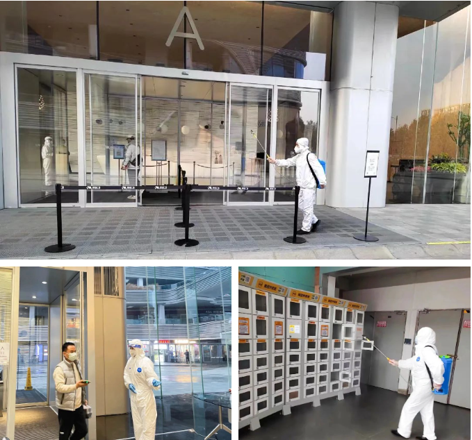 在明確復工時間后,建業(yè)物業(yè)迅速組織工作人員,對公共區(qū)域進行全面消殺,并對電梯、客戶公司門把手、垃圾桶等區(qū)域進行重點消毒。設(shè)置體溫監(jiān)測儀、更新場所碼,為即將到來的復工做好充分準備。