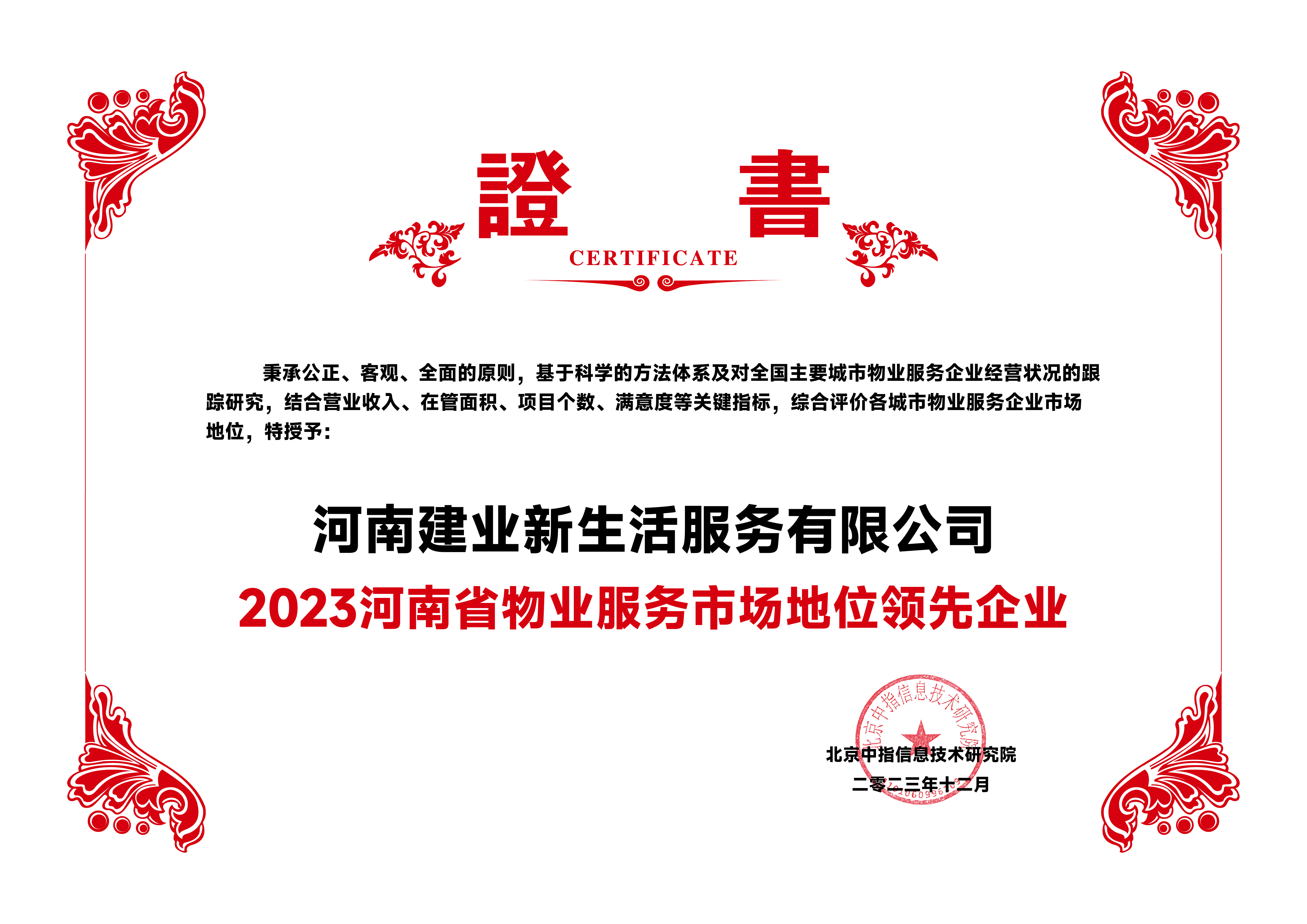 2023年12月7日,由北京中指信息技術(shù)研究院主辦,中國房地產(chǎn)指數(shù)系統(tǒng)、中國物業(yè)服務(wù)指數(shù)系統(tǒng)承辦的“2023中國房地產(chǎn)大數(shù)據(jù)年會暨2024中國房地產(chǎn)市場趨勢報告會”在北京隆重召開。河南建業(yè)新生活服務(wù)有限公司憑借雄厚的綜合實力,榮膺“2023中部區(qū)域物業(yè)服務(wù)市場地位領(lǐng)先企業(yè)(TOP1)”“2023河南省物業(yè)服務(wù)市場地位10強企業(yè)(TOP1)”。 會上發(fā)布了“2023中國物業(yè)服務(wù)上市公司ESG測評研究報告”。中指研究院、中信證券研究部、北京秩鼎公司聯(lián)合對物業(yè)管理行業(yè)ESG體系開展研究與測評,對59家物業(yè)服務(wù)上市公司2022年度ESG報告表現(xiàn)進行了測評研究,將ESG報告評分按照總體得分排序。建業(yè)新生活榮獲“2023中國物業(yè)服務(wù)